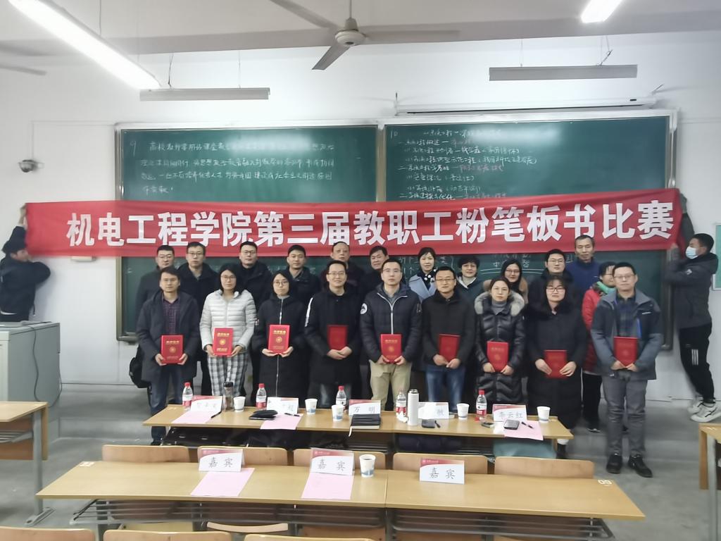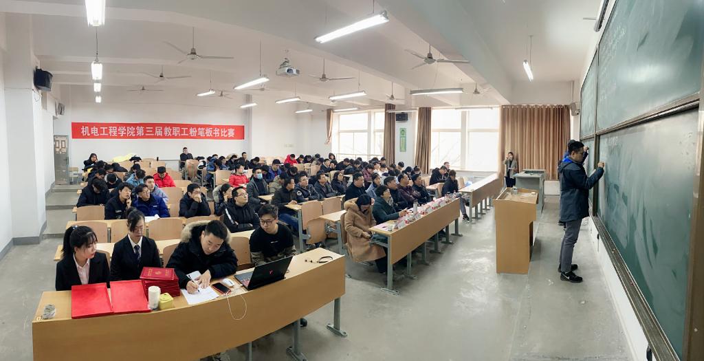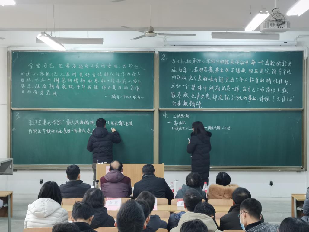 本次比赛的评委由校教务处处长万明、校教学督导专家王贯超、马克思主义公司教授曹敏、材料工程公司执行经理贺辛亥、电子信息公司副经理李云红担任。12名选手按照抽签顺序,分为6组依次上台书写、展示。板书内容为课程思政元素融入专业课程教学。经过评比,最终工业工程党支部书记宋栓军老师荣获本次比赛一等奖。