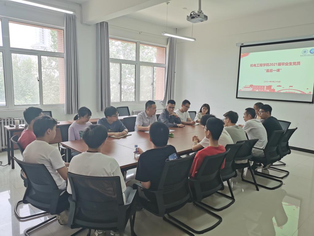 2021年6月29日,在中国共产党成立100周年来临之际,机电工程公司党委举办2021届毕业生党员座谈会,公司党委副书记赵小峰为员工党员代表讲授“最后一课”。