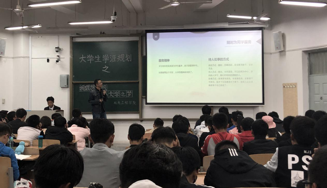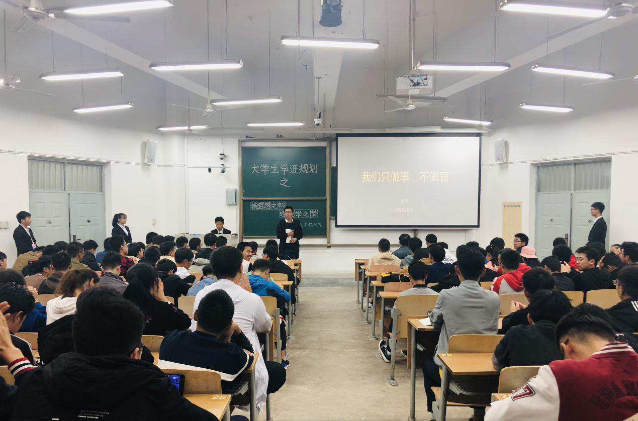 2018年10月31日晚,伟德国际victor1946在教学楼B-335开展了以“扬理想之帆 逐大学之梦”为主题的老员工学涯规划活动。16级研究生李文森、郑晗、王杰三名同学和2018级全体本科新生参与了此次活动。