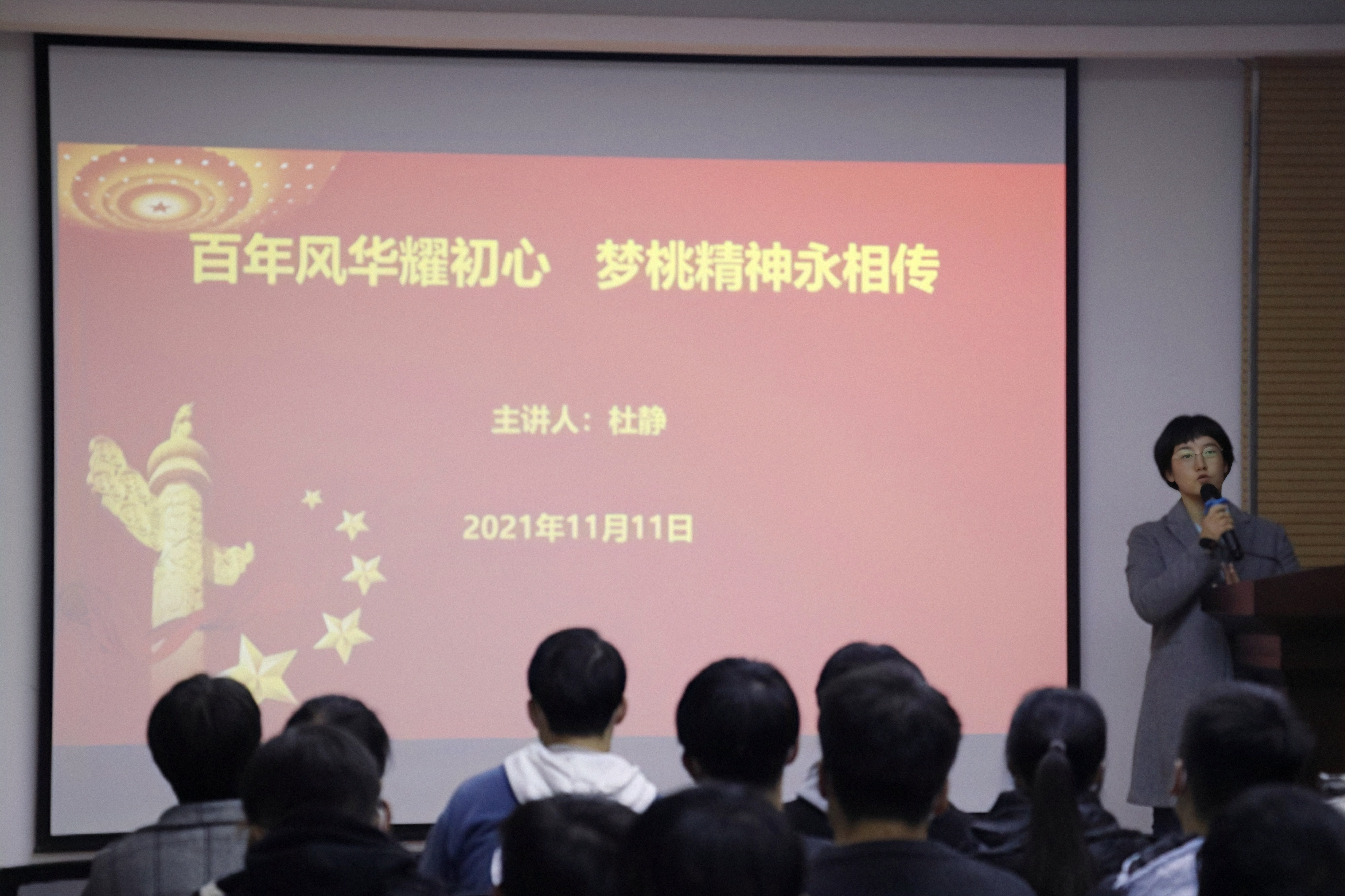 2021年11月11日晚,伟德国际victor1946力行致远导师团举办“百年风华耀初心梦桃精神永相传”主题党日活动,机制员工第二党支部书记杜静讲授了专题党课,50多名员工党员参与活动。