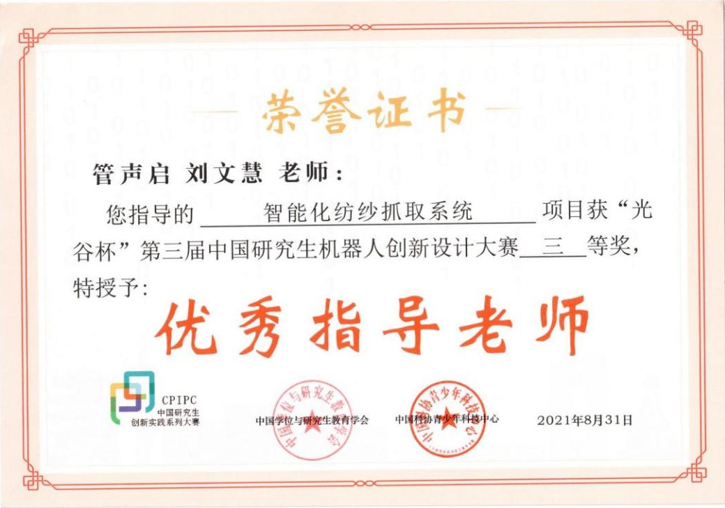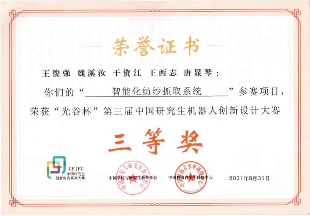 2021年8月24日至25日,“光谷杯”第三届中国研究生机器人创新设计大赛全国总决赛在线上举办。经过激烈角逐,伟德国际victor1946管声启教授、刘文慧副教授指导的硕士研究生王俊强、魏溪汝、于资江、王西志、唐显琴等五位同学的参赛作品《智能化纺纱抓取系统》入围全国总决赛并荣获国家三等奖,指导教师获得优秀指导教师称号,同时公司荣获全国“优秀组织奖”称号。