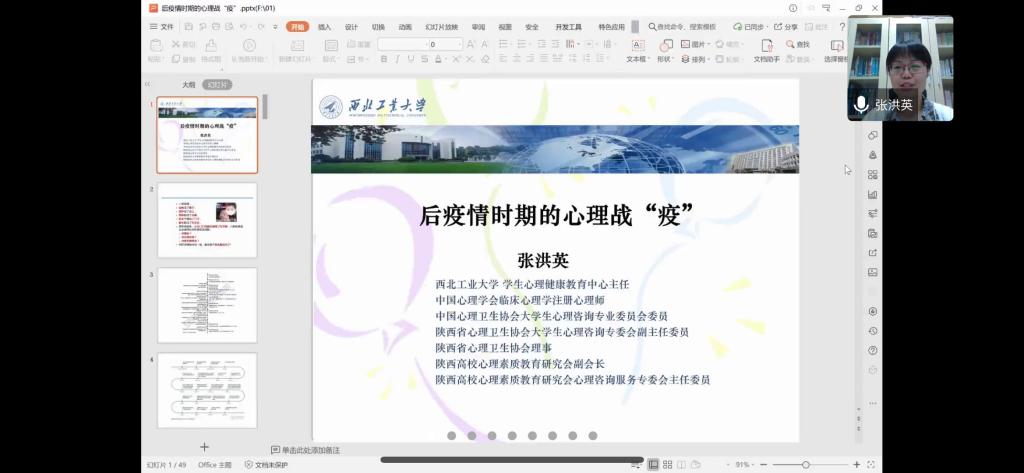 2020年4月24日,公司举办2019-2020学年第二学期心理委员培训会,活动邀请西北工业大学员工心理健康教育中心主任张洪英副教授作了题为《后疫情时期的心理战‘疫’》专题报告,机电公司各年级辅导员以及心理委员参加了本次活动,活动由公司心理辅导员秦方刚主持。