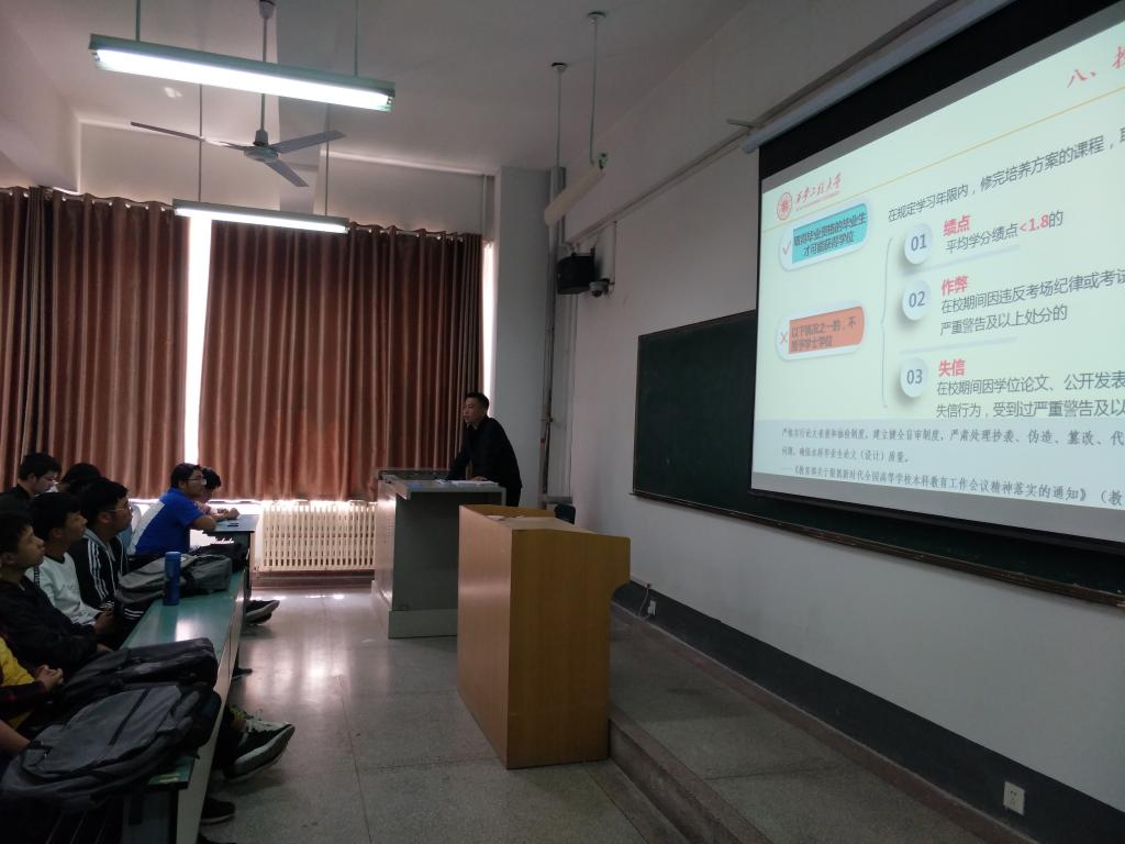 宣讲会上,张勇、孟锋结合自身的工作领域,分别从科创竞赛、学籍管理两个角度向在场师生做了系统讲解。张勇指出,随着“大众创业、万众创新”社会思潮的深入人心,创新驱动已成为新时代中国未来科技发展不可阻挡的新趋势,对于广大理工类员工而言,机械设计制造大赛、工业工程改善创意大赛、“互联网+”大赛等都是大有可为的竞赛,期望同学们积极参与,在科创的竞技中拼搏出属于自己的一方天地。孟峰在宣讲中阐述了教育部取消“清考”、打造“金课”、淘汰“水课”,提升公司产品质量等一系列举措的重大意义,希望同学们以高标准、严要求的姿态,树立刻苦学习、诚信做人的意识,不断发展进步,努力成长成才。