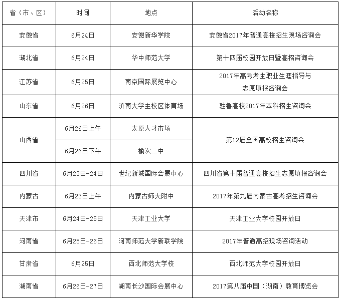 为了方便广大考生及家长了解公司的团队建设、办学特色、人才培养、毕业生就业及2017年招生情况等。公司将安排工作人员赴部分省(市、区)参加招生宣传咨询会,开展招生宣传工作,具体情况如下: